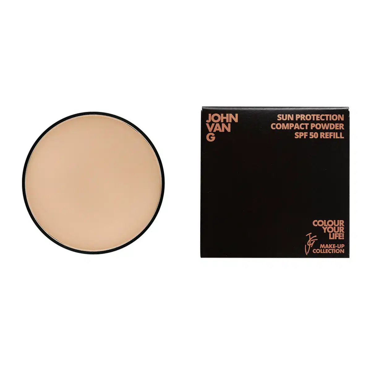 JvG make-up collection Sun Protection Compact Powder navulling. Het poeder van John van G beschermt de huid tegen veroudering en zorgt ervoor dat de huidcellen niet beschadigd worden. Het poeder absorbeert overbodige talg op de huid en zorgt voor een matte finish. Zo ziet je huid er nooit glimmend uit. Het product heeft een hoge factor en beschermt de huid goed tegen de zon.
